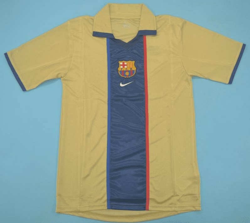Get your hands on the iconic Barcelona 2001-02, Gold Away retro football shirt today. Official remake with high-quality finish – perfect for any collection. Order now from Legends Gallery. Retro football kits with worldwide shipping available.