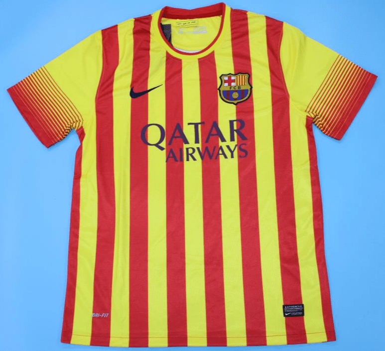 Get your hands on the iconic Barcelona 2013-14, Away retro football shirt today. Official remake with high-quality finish perfect for any collection. Order now from Legends Gallery. Retro football kits with worldwide shipping available.