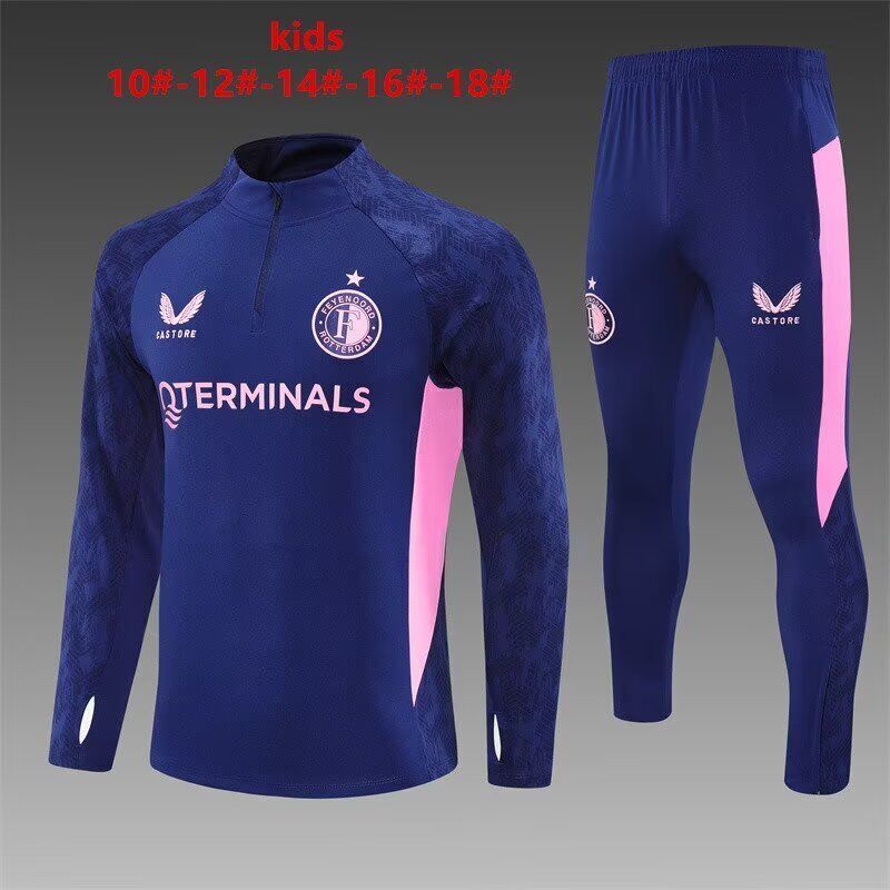 Feyenoord Kids Tracksuit 2025-2026 Dark Blue and Pink Retro Kit. Perfect for collectors and fans. Worldwide shipping available. High-quality with classic design. Shop Feyenoord Kids Tracksuit 2025-2026 Dark Blue and Pink retro kits today at Legends Gallery.