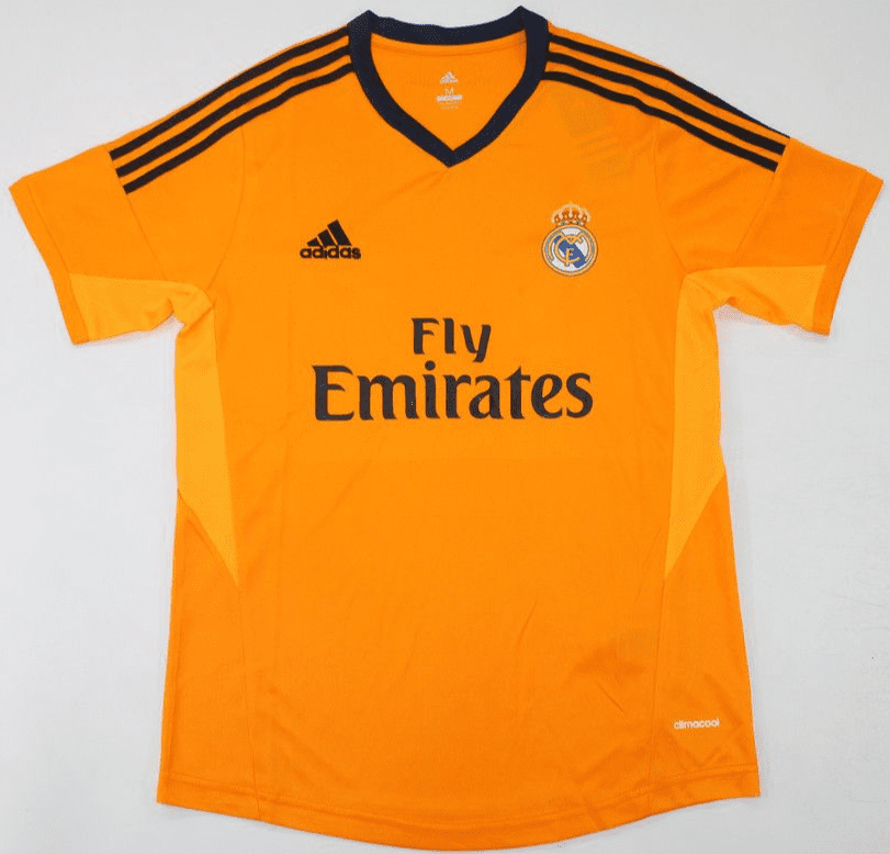 Get your hands on the iconic Real Madrid 2013-14, Orange Third Away retro football shirt today. Official remake with high-quality finish – perfect for any collection. Order now from Legends Gallery. Retro football kits with worldwide shipping available.