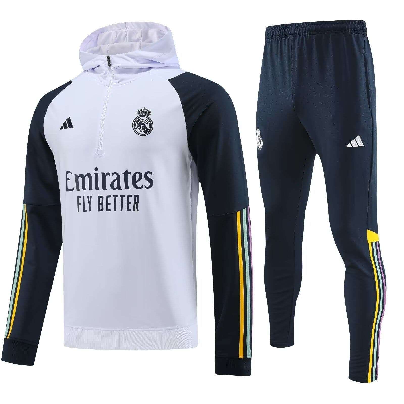 Get your hands on the iconic Real Madrid 23-24 White Tracksuit with Hood retro football shirt today. Official remake with high-quality finish perfect for any collection. Order now from Legends Gallery. Retro football kits with worldwide shipping available.